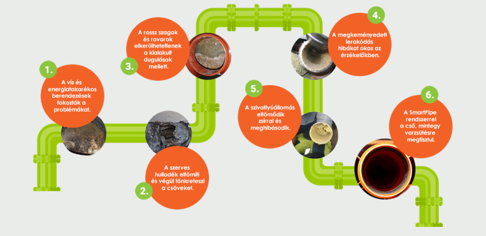 A SmartPipe egy mikrobiális alapú csatornatisztító és -karbantartó rendszer, amely természetes módon gondoskodik a szennyeződések lebontásáról.