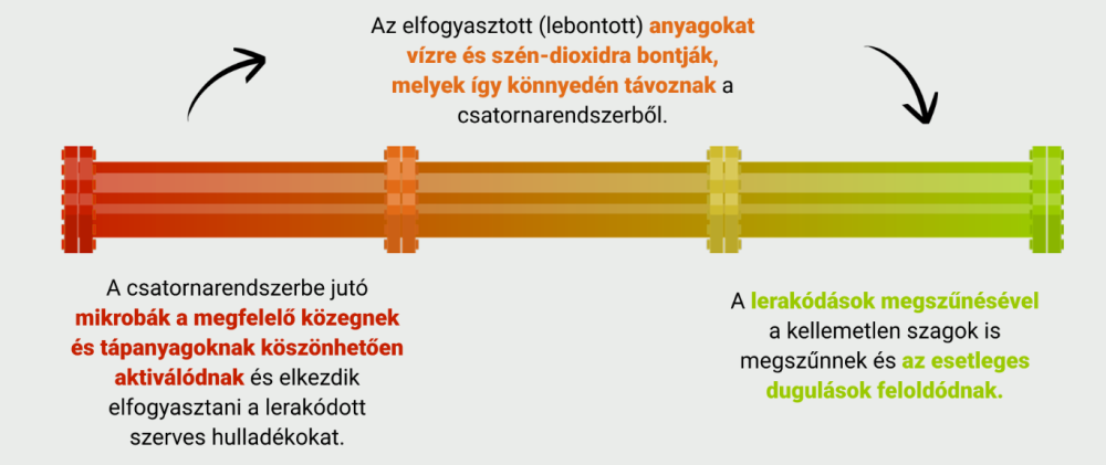 A rendszer egyedi mikrobatörzsei a lefolyóba juttatva enzimek segítségével: