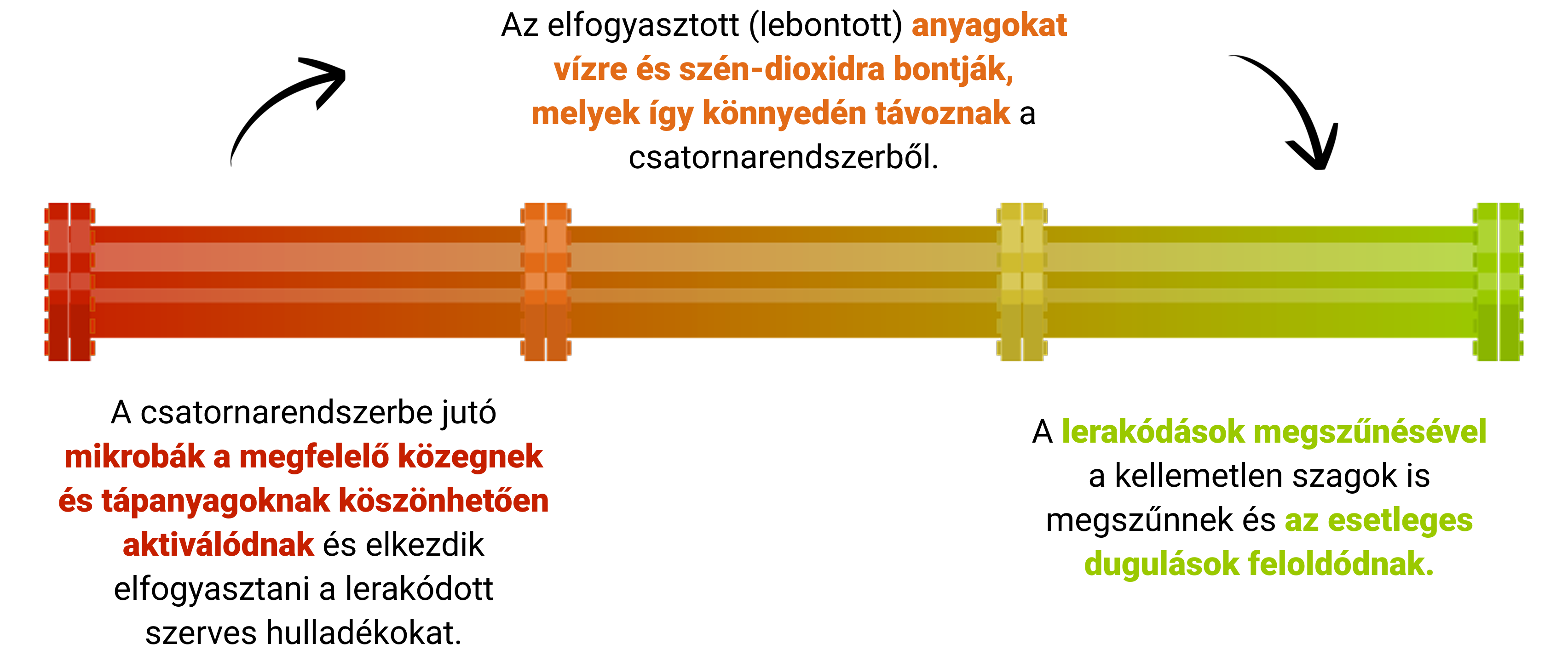 A SmartPipe rendszer alapja a speciális mikrobatörzsek alkalmazása, amelyek a csővezetékbe jutva azonnal aktiválódnak. Ezek a természetes mikrobák lebontják a zsírokat, olajokat, keményítőt és más szerves hulladékokat, miközben kizárólag víz és szén-dioxid marad vissza. Ez a fenntartható folyamat megszünteti a kellemetlen szagokat, feloldja a dugulásokat, és megelőzi az újabb lerakódások kialakulását.